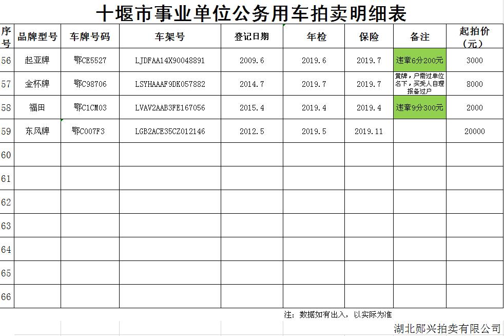 受委托,湖北鄖興拍賣有限公司向社會公開拍賣張灣區(qū)、鄖陽區(qū)公務(wù)用車60余輛( 有大眾、本田、別克、日產(chǎn)、現(xiàn)代、雪鐵龍等)。